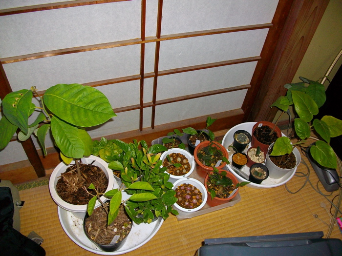 パッションフルーツ、バオバブ、イポメア、サボテン(兜丸)、ジャボチカバ挿木、と多肉少々です。