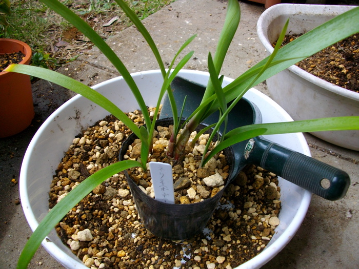 抜いたネリネを若干根鉢を崩し、あたらしい鉢に植えかえます。今度はいくら太ってもいいようにビニール鉢にしてみました。