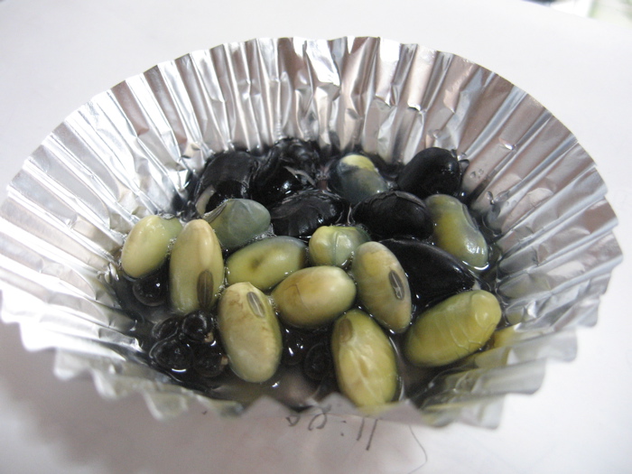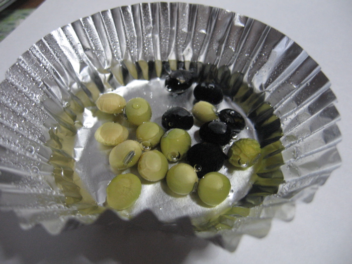 早生枝豆を10粒、黒枝豆を5粒で、オクラも一緒に。