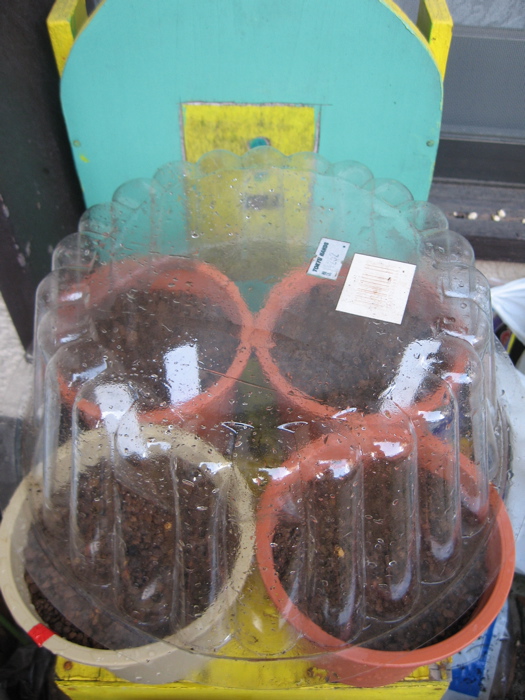 マメ科をまくとき、どうやら最初のうちは鳥とかにほじくられるそうなので、保湿用のプラスチックケースを鳥避けとしてかぶせておきました。