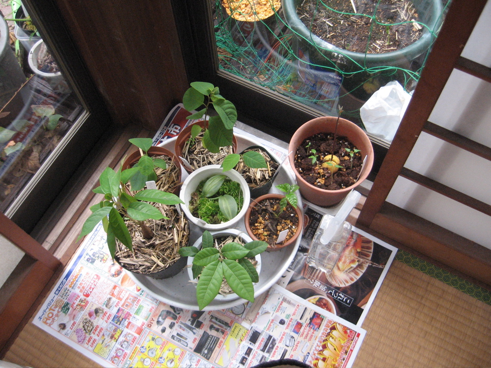 ドリアン、リュウガン、バニラ、アボカド、チェリモヤ、パッションフルーツ、タマリロ(アボカド鉢の中に生えてるやつです)
