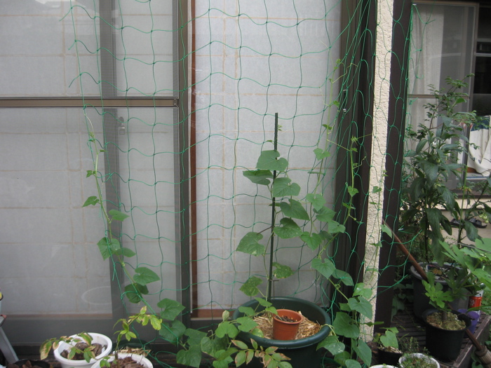 支柱でやると誘引とかめんどくさいので、2mくらいのネットを貼って放置したいと思います。一応…「緑のカーテン」ってことで(笑)