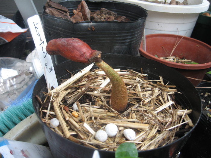やっと首をもたげてきました……というのが数日前の写真で、昨日ドリアンを確認したら種の帽子がはずれていました。やっとです、長かった!