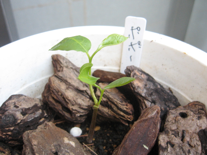 蒔種してからだいたい半年くらいたってます。ポポーが発芽するには一度寒さにあてる必要があるらしく、乾燥にはそれなりに強いので、冬の間は蒔かないでそこらへんにほっぽっておいても発芽するみたいです。濡らしておくと腐ってしまうことも多いですからね。
