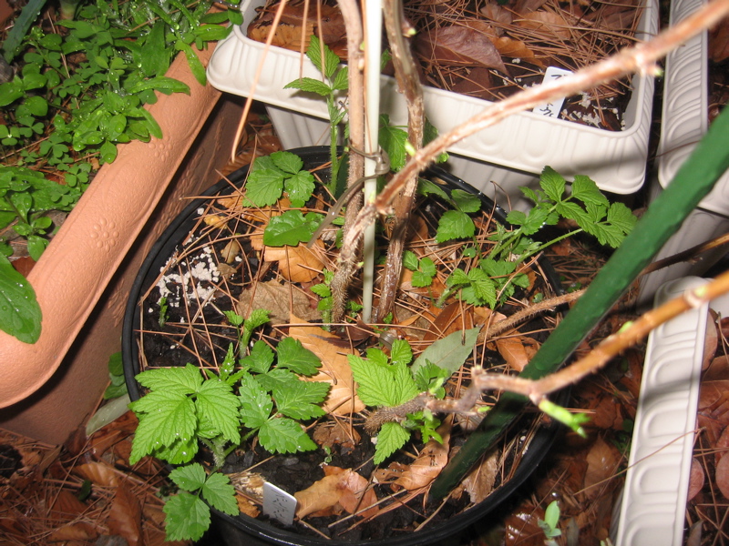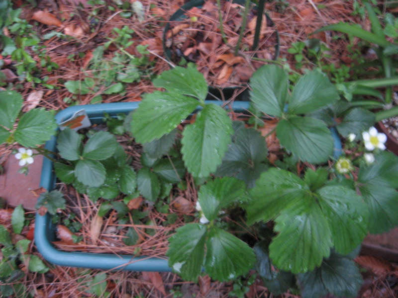 鉢の右側のもさもさは全部章姫で、さらに左側で花を咲かせているのも章姫のランナーでいつの間にか増えた株です。早生はかなりわかりにくいですが、真ん中より左寄りのやつです。
